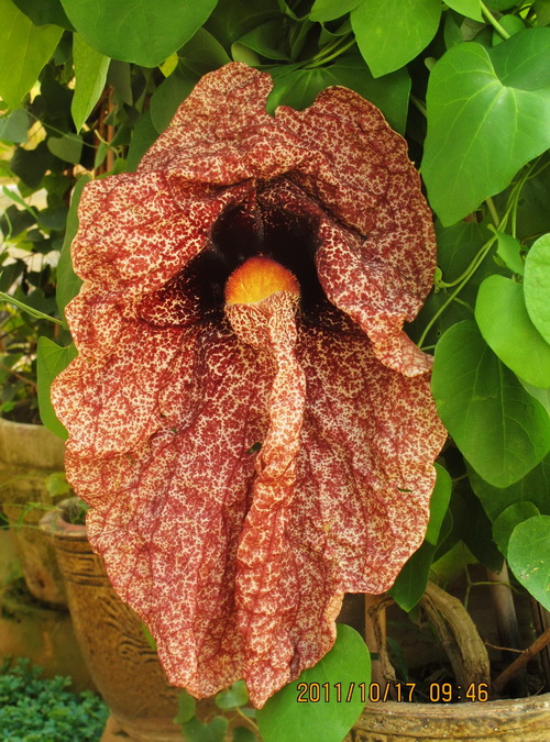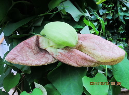 盛开的巨花马兜铃,其花型巨大,椭圆心形,花被褶折,紫红色、白色的斑纹交错,看起来色彩艳丽而又略显神秘,这些显著的特征,令其让人过目不忘。