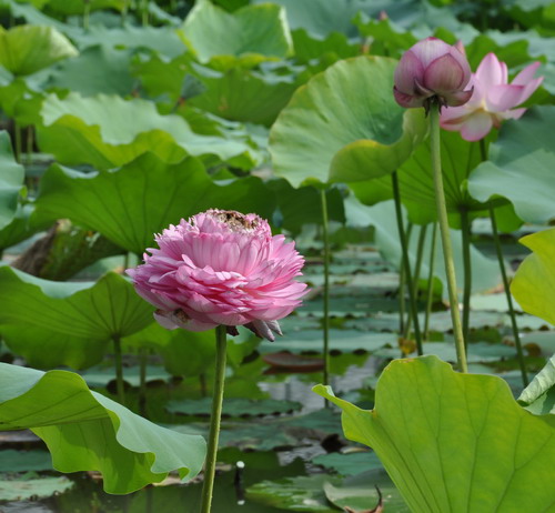 除了千瓣莲品种,华南植物园还保育有“中山红台”、“大洒锦”、“友谊牡丹莲”、“神女姿”和“美洲黄莲”等100多个珍贵荷花品种,市民不用出市区就可以在植物园内赏荷休憩,享受夏日清凉。
