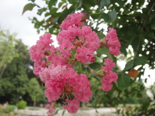 紫薇(Lagerstroemia indica Linn.) ,千屈菜科(Lythraceae)紫薇属。中文别名:痒痒树、百日红、满堂红。紫薇为小乔木,有时呈灌木状,高3~7米;树皮易脱落,树干光滑。树干愈老愈光滑,用手抚摸,全株微微颤动,故又称为痒痒树。花瓣红色或粉红色,边缘有不规则缺刻。花期6~9月,果期9~12月。原产于亚洲,我国华东、华中、华南及西南均有分布,各地普遍栽培。