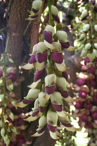 禾雀花(Mucuna birdwoodiana Tutcher),蝶形花科黎豆属,又名白花油麻藤、雀儿花,常绿木质大型藤本。分布于广东广西,喜温暖湿润气候,耐荫耐旱,畏严寒。该种生长迅速,蔓茎粗壮,叶繁荫浓,茎长可达30米以上,其生命力顽强,能盘树缠绕,越冠飞枝,攀石穿缝。其花序悬挂于悠长盘曲的老茎上,吊挂成串,每串二、三十朵,串串下垂。酷似无数白中带翠,如玉温润的小鸟栖息在枝头。