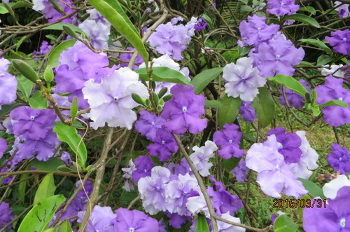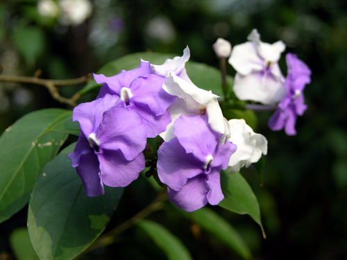 鸳鸯茉莉(Brunfelsia acuminata Benth.)为茄科多年生常绿灌木,又称五色茉莉、二色茉莉、番茉莉。株高约1米,单叶互生,椭圆形,叶柄极短;花单生或数朵聚合成聚伞花序,花朵从破蕾到盛开之初,颜色为深紫色,随着时间的推移,花冠的深紫色逐步变淡,最后成为纯白,鸳鸯茉莉的每一朵花都会经历这种变化过程,由于花朵开放时间不一,先开的已变白,后开者仍为深紫,二色花齐放枝头,故有“鸳鸯茉莉”之称。其英文名意为“昨天、今天、明天”,也形象地描绘出花色的特殊变化。