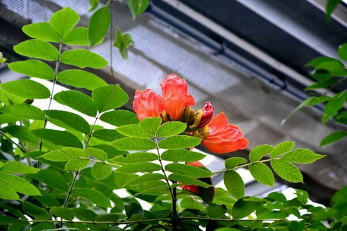 春暖花开是赏花踏春的好时节,华南植物园就是个好去处。在温室景区前的大草坪上,有一棵树花开的正艳,远远望去犹如一团团燃烧的火焰在枝头跳跃,她就是火焰树。