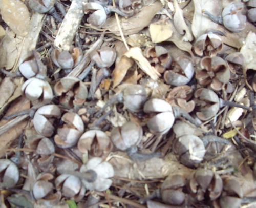 木荷 (Schima superba Gardn. et Champ.),山茶科木荷属常绿大乔木,俗称小叶蚁木。树可高达30米,树皮灰褐色,块状纵裂。单叶互生,革质或薄革质,长椭圆形,长6~15厘米,宽2.5~5.0厘米,先端渐尖或短尖,侧脉在两面明显,叶缘有钝锯齿。4月开白色或浅黄色的芳香花朵, 花单生枝顶叶腋或成短总状花序,白色,具芳香,径约3厘米。10月果熟,蒴果近球形,黄褐色,木质五裂,可以用来做陀螺玩具。种子肾形,扁平,边缘有刺。荷木的汁液会使人的皮肤瘙痒难忍。