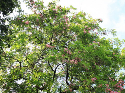 当您漫步在广州第一村入口,向远处眺望,不难发现远处一棵树上装扮着一抹抹“粉霞”,格外惹人注目。走近一看,原来是花开正茂的粉花决明。巍然耸立的树上开满一簇簇粉红色的花朵,艳丽夺目,花姿飘柔下坠,异常优美。树冠如盖带来大片浓荫,粉红的花朵娇艳美丽,为这炎炎夏日带来好心情。