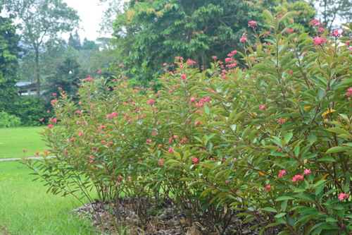 日日樱(Jatropha Pandurifolia Andrews),别名:琴叶珊瑚、南洋樱、琴叶樱,为大戟科(Euphorbiaceae)多年生常绿灌木,高1-2米。单叶互生,倒阔披针形,常丛生于枝条顶端。聚伞花序,花冠红色,花瓣5片,为单性花,雌雄同株。雌雄花分别着生于不同的花序上,雌花长在花序的中心,侧生4-6朵雄花,象众星捧月一样。蒴果球形,青绿色转黑褐色。