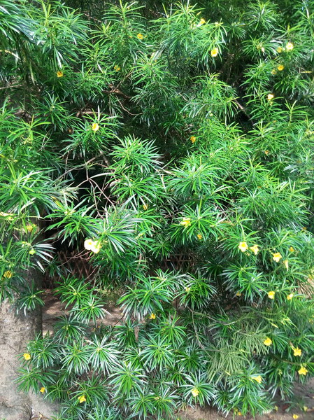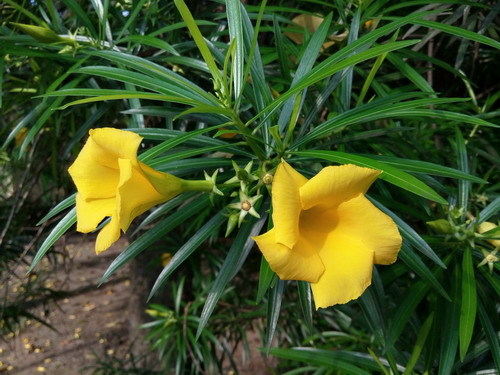 黄花夹竹桃(Thevetia peruviana (Pers.) K. Schum.),是夹竹桃科(Apocynaceae常绿乔木或小乔木,又名黄花状元竹、黄酒杯花。树高达5米。全株无毛,树皮棕褐色,皮孔明显,枝柔软下垂。全株具丰富白色乳汁。叶互生,羽状脉。顶生聚伞花序或腋生;花大,黄色具香味,花萼5深裂,裂片三角状披针形,内面基部具腺体;花冠漏斗状,裂片阔,花冠筒短,下部圆筒状,花冠筒喉部具被毛的鳞片5枚;雄蕊5枚,着生于花冠筒的喉部,花药与花柱分离;无花盘,子房深裂。核果的内果皮木质坚硬,花期每年5-12月,果期8月至翌年春季。