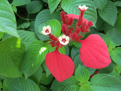 红纸扇(Mussaenda erythrophylla Schumach. & Thonn.)又名血萼花、红叶金花。是茜草科(Rubiaceae)半落叶灌木,株高1-1.5米,叶纸质,披针状椭圆形,叶脉红色。聚伞花序顶生,花冠五角星状,黄色,迷你巧致,有“金花”的美称,可惜细小且易脱落。花期夏、秋季。更具观赏价值的是深红色叶状萼片,如片片红云绽放枝顶,形成“绿叶衬红花”的美景。园林上常配置于林边,草坪周围或小庭院内,颇具野趣,是优良的园林绿化灌木。