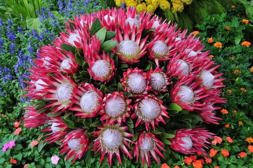 如今在世界各地栽培的帝王花多为灌木状,植株高达1m,枝叶茂盛,叶片富有光泽,花期长达半年以上(5月—12月)。其凭借着久开不败的秉性,巨大的花形、鲜艳的色彩、百年以上的寿命,而深受南非甚至全世界人的喜爱,被誉为全世界最富贵华丽的鲜切花。其实,我们通常所见到的巨大地如花冠般的帝王花并非只是一朵花构成,而是一个花球。在花球中间,有无数向上支起的花蕊,在花蕊之下才是一朵朵小花,它们在拥挤下争相开放,却不失明媚。在最外围,是巨大的苞片,它们包裹起这大大的花球,并辅以鲜艳之色,更显示了花朵的霸气,难怪它又被称为木本切花的“巨无霸”。