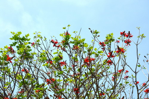 刺桐(Erythrina variegata),为蝶形花科(Papilionaceae)落叶乔木,高可达20米,树皮灰褐色,枝有明显叶痕及短圆锥形的黑色直刺。总状花序顶生,上有密集、成对着生的花;花萼佛焰苞状,一边开裂;花冠红色。荚果黑色,肥厚,种子肾形暗红色。花期12月到次年3月,果期8-9月。