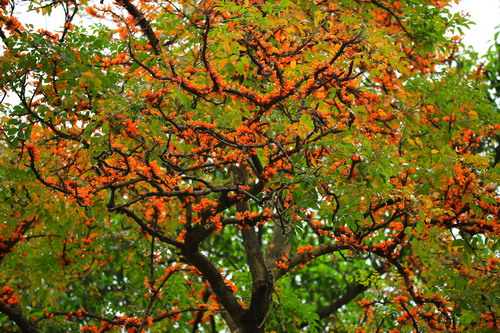 通常植物的花果生长在一、二年生枝条上,但在热带雨林层层叠叠的植被丰富,生存竞争异常激烈,花朵为便于植物“红娘”更好为其传粉,繁衍后代,花朵盛开在老枝、树干甚至树干基部,这种奇妙的进化现象叫做老茎生花结果。依此看来火烧花不仅颜值高而且也活得够拼。植物都尚且如此,你还能停下脚步?