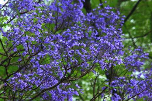 蓝紫色朵朵小花簇傲立枝头,羽状叶片轻盈摇曳。此情此景颇有几分‘紫玉’妆成一树高、万尾羽毛轻飘飘之意境。木本植物中很少开蓝花,高大乔木中开蓝花的就更少,因此蓝花楹更显珍贵。蓝花楹在世界各地广受欢迎,澳大利亚街道两旁种植许多蓝花楹;南非行政首都比勒陀利亚有“蓝花楹之城”的美誉。