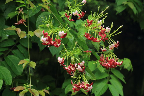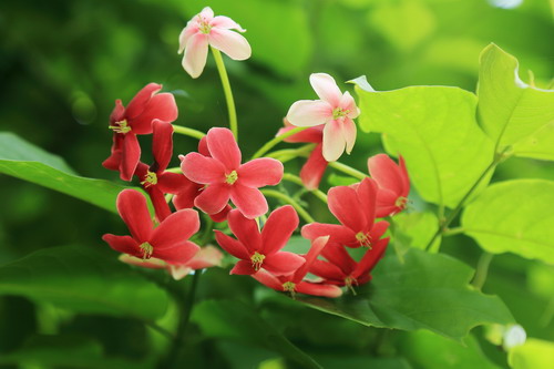 使君子花期夏秋,在广州从5月开始,能一口气开到10到11月之后才慢慢消停,一年有2次以上的盛花期。使君子亦药亦花,不仅是我国的一味传统中药,而且花繁叶茂,轻盈优雅,芳香醉人,在园林应用上是优良的藤架植物或半直立的绿化分隔带植物。