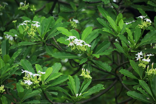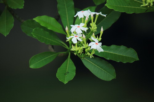 海杧果(Cerbera manghas L.)别名黄金茄、牛心荔。叶互生,厚纸质。聚伞花序顶生,花冠高脚碟状,花冠裂片的颜色由外向内中心呈雪白、淡红、黄多种颜色递进,构成美丽迷人的“花中花”图案。夜晚,淡淡的茉莉香味吸引着甲虫为其授粉。海杧果生于海滨湿地或低海拔红树林,在野外树高可达12m。果实先绿后粉,再变为紫红并最终为黑色,椭圆形或球形,内果皮木质或纤维质。因果实像芒果而得名。但其实它和芒果没有亲缘关系,芒果是漆树科植物,而海杧果却是夹竹桃科(Apocynaceae)的常绿乔木。在海边,果实成熟后就落到海里浪迹天涯,寻找安身之处。当它最终靠岸着陆时,往往只剩一层纤维包围着依然硬实的种子,更便于它们发芽扎根。