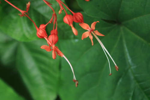 状元红(Clerodendrum japonicum (Tunb.) Sweet)又名赪桐、百日红,是马鞭草科(Verbenaceae)落叶灌木,株高1-2米。深绿色的叶子对生,呈大大的心形,触之有臭气。花红色,具有芳香,为总状圆锥花序,向一侧偏斜;花萼细小,漏斗形;花冠红色,雄蕊长长地伸出花冠外,并且向上卷翘。花梗、花萼、花冠、花药、花丝均为红色,着生花朵的茎秆也是红色,在绿叶的衬托下绚丽而娇艳,美不胜收。果实椭圆状球形,绿色或蓝黑色。花果期5-11月。