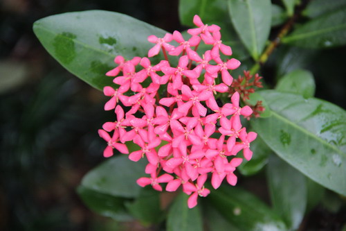 龙船花(Ixora chinensis Lam.),又名仙丹花、水绣球,茜草科(Rubiaceae)常绿小灌木。叶倒卵形至矩圆状披针形,新叶红色。聚伞花序顶生,花序具短梗,有红色分枝;花冠裂片4,花色以红色最为常见,还有白、黄、橙等色。花期5-12月。