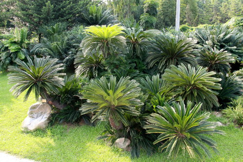 夏日午后,漫步在华南植物园的苏铁园,仿佛穿越时光回到远古的侏罗纪恐龙花园,眼见苏铁丛林中点缀着的几个恐龙模型,不禁想,在距今6500多万年前地球所遭遇的那场巨大的灾难中,曾经称霸地球的恐龙家族消亡了,而同一时代的苏铁却仍然在地球上生生不息,苏铁究竟凭借什么本领顽强生存至今呢?也许正是因为恐龙的灭绝使其免遭成为口粮的劫难而成全了它,又或是它自身的不屈得以绵延亿万年?今天就让我们来了解一下这地球上最古老的植物——苏铁(铁树)。