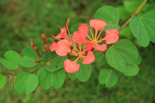 橙花羊蹄甲(Bauhinia galpinii N. E. Brown),为豆科(Fabaceae)羊蹄甲属常绿藤状灌木,又名南非羊蹄甲、嘉氏羊蹄甲。树形低矮,株高仅50-150cm,枝条细软,枝极平整,向四周匍匐伸展,冠幅常大于高度。叶革质互生,双肾蝴蝶型,形状如羊蹄,故名。花大量,伞房或短总状花序顶生或腋生于枝梢末端,花瓣5瓣,橙红色,热情洋溢,花期5-10月。荚果扁平,初为绿色,成熟时为褐色,且木质化,常宿存。
