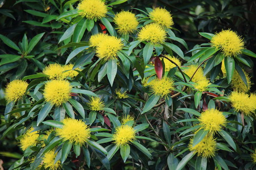 金蒲桃(Xanthostemon chrysanthus (F. Muell.) Benth.),别名黄金熊猫、黄金蒲桃,澳大利亚特有植物。桃金娘科(Myrtaceae)常绿小乔木,叶对生、互生或丛生枝顶,披针形,全缘,革质,叶表光滑,搓揉后有番石榴气味,新叶带有红色。花序呈球状,初开时黄绿色,随后转为黄色,近凋谢时为金黄色。虽说是花,其实其花瓣已退化,只有明显的圆形萼片和花蕊,雌雄蕊长长伸出,丝丝放射,格外别致。全年有花,盛花期为11月到次年2月,果为蒴果。