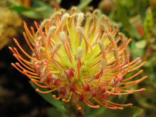 针垫花,形如其名,花朵盛开时像大头针插在球形的针垫上,非常少见,十分美丽。颜色鲜艳夺目,五色缤纷,很是招人喜爱,常见的颜色有红色、黄色、橙色等。其实我们所见到的拳头般大小花球是由无数个小花朵组成的,那伸出的“针头”正是一个个舞动的花蕊。据了解,在南非针垫花开的季节还有一个非常吸引人的景色,那就是无数个围绕在花丛中的小鸟。针垫花不能自花授粉,必须以丰富的花蜜吸引了各种各样的昆虫,而这些昆虫必须穿越密布的“针林”才能享受到甜美的花蜜,而昆虫正是小鸟们猎食的对象。正是这样,针垫花不仅吸引了观花者,同时也吸引了众多观鸟者。