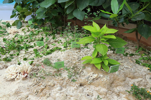 国庆期间,温室群景区还举办“热带珊瑚岛植物展”。热带珊瑚岛为分布在热带海洋中,由海中的珊瑚虫遗骸堆筑的岛屿,我国的南海诸岛,就属于热带珊瑚岛,由200多个岛屿、沙洲、礁滩组成,分为东沙群岛、西沙群岛、中沙群岛和南沙群岛。由于南海诸岛形成的年代较晚,面积小、海拔低,岛上无法形成特优种,植物都是从邻近的大陆和岛屿通过海流、鸟类、风及人类等传播过来,与邻近国家和地区植物区系联系紧密。据统计,陆上植物共有97科400多种。岛上海岸林生长茂密,乔木层可高达20米,优势种有榄仁树、麻风桐、海岸桐、莲叶桐、橙花破布木等,外侧是草海桐、海巴戟、海人树、水芫花等组成的灌木带,最外侧分布着厚藤、海刀豆、海滨大戟、蒭雷草等低矮植物。此次展览共展出热带珊瑚岛上的特色植物18种。