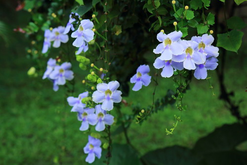 每年的夏秋季,苏铁园入口的凉亭上,大花老鸦嘴成串大朵浅蓝色的花儿垂挂而下,编织成美丽的藤帘,如梦似幻。大花老鸦嘴(Thunbergia grandiflora Roxb.),又名大邓伯花、大花山牵牛、山牵牛,爵床科(Acanthaceae)粗壮木质常绿大藤本,原产孟加拉、泰国、印度、中国,广植于热带和亚热带地区。