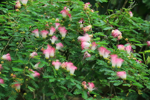 一看到这种花,就会被它粉粉的、软软的、毛绒绒的可爱模样所吸引,忍不住想用手碰碰, 这种花叫苏里南朱缨花(Calliandra surinamensis Benth.),又名长蕊合欢、粉扑花,为豆科(Leguminosae)落叶灌木或小乔木。枝条开展,树形优美,如反撑的伞。叶如羽片,每当夜幕降临,叶片会害羞地闭合起来,次日早晨再展开,早睡早起,如人类作息般,这种行为被称为睡眠运动。头状花序状如红缨,花丝极多,细长,基部白色,上端粉红色,聚合成半球状,像极了姑娘化妆用的粉扑,故名粉扑花。花期4-10月。