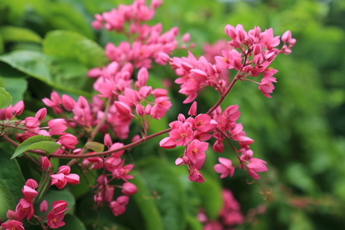 十月,虽然南国广州还是气温高企,但在北方,已进入秋天丰收的季节,而选择在十月结婚的人士也真不少,大家是不是这个月都收到不少“粉红炸弹”呢?今天我们要介绍的花的花语是“爱的链锁”,象征着一种爱的承诺。在西洋神话中,相传有位貌美的女神吸引了众神,却无人能打动她的芳心,有位聪明的山神从山里采回许多藤草,编织成藤衣和项链,送到女神的住处。女神开门的刹那,因阳光照射“藤衣和项链”绽放出千朵粉灿呈珊瑚状的小花,山神因此赢得了女神的芳心,这种藤草就是珊瑚藤。