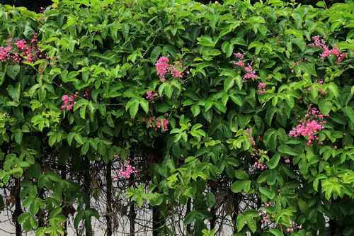 珊瑚藤茎蔓攀爬能力强,花色艳丽夺目,花期长,适合花廊、花架、花墙、围篱或荫棚的美化,为园林垂直绿化的理想材料。