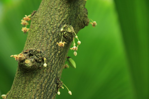 可可(Theobroma cacao L.),梧桐科(Sterculiaceae)常绿乔木,生长于潮湿的热带雨林低地里,尤其喜欢待在高大树荫下。树高达15米,树冠繁茂,叶长可达20-30厘米,长椭圆形。她是典型的老茎开花结果,花簇生于树干或主枝条,白色,精致细小,主花期为5-11月,熟果期4-5月、9-11月。植后4~5年开始结实,每年每株产豆荚60-70枚。果实长椭圆形、纺锤形,外皮具纵沟,较厚,酷似橄榄球,初为浅绿色,成熟后变为橙黄、褐红色;内有种子(可可豆)30-50粒,埋藏在胶质果肉中,卵形或椭圆形;可可豆含40-50%的可可脂,经过发酵及烘焙后可制成可可粉。