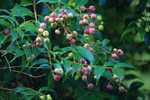今日的广州还是20多度的高温,阳光猛烈,说好的冷空气也不见踪影。但华南植物园内的植物已呈现一派秋的景象,落羽杉、枫香、大叶紫薇的树叶都开始变红了,而肖蒲桃枝头则挂满了圆圆的成熟小果实,预示着丰收的季节来到了。那紫黑色的小果子,让人忍不住想摘来尝一尝。别怕,这个果实真的能吃哦,今天就让我们来了解一下。