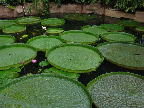 王莲是水生有花植物中叶片最大的植物,有“水上花王”的美誉。其初生叶针状,长至2-3片时矛状,4-5片时戟形,6-7片叶时完全展开呈椭圆形至圆形,叶缘直立上翘呈盘状,像数个大圆盘浮于水面,直径达1.5m以上。由于王莲的叶子背面布满了由中心向四周放射状的粗壮叶脉,叶脉内部具有特别发达的通气组织,里面储藏大量的空气,使得每片叶子浮于水面,可承重数十公斤的重量,因此小孩子坐在叶盘上面也不会下沉。多年连续生长的王莲叶片更大、占据极大的水域面积,可达十数乃至几十平方米,非常壮观。娇艳的花朵在水面绽放,一株王莲即可形成异常美丽的生态水景,让人赞叹。