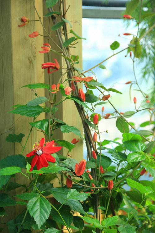 说起西番莲,大家首先想到的就是能吃的百香果吧。而在寒冷的冬日里,华南植物园奇异植物室内,百香果的亲戚——洋红西番莲正以艳光四射的红花演绎冬日魅力。热情奔放的花朵开在长长的廊架下,让人忍不住定睛去数一数,每一朵花上有几种颜色呢?