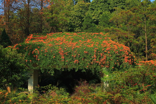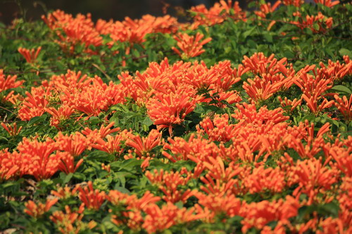 “爆竹一声除旧岁”,春节放鞭炮作为传统习俗,历史悠久,为节日增添了欢乐的气氛。如今,由于燃放烟花爆竹造成环境污染、火灾及人员伤亡等,不少城市都已禁止在公共场所燃放,这一传统习俗也就慢慢淡出人们的视野。虽然不能放鞭炮了,可南方的市民,在春节前后能欣赏到如串串鞭炮一样喜庆的炮仗花。那一串串橙红色的花朵从1月份开始绽放,一直开到4月份,串串即将燃爆的“鞭炮”垂挂枝头,数量极多,非常壮观,为春节带来浓郁的节日喜庆气氛。华南植物园的炮仗花在春节前开始开花,现已进入盛花期。