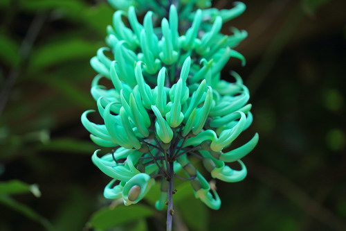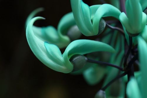 翡翠葛(Strongylodon macrobotrys A. Gray)又名碧玉藤,蝶形花科碧玉藤属木质藤本,来自菲律宾。其花朵沿着花梗呈平展状生长,每一串花有数十朵,每一朵盛开的花像是一只翡翠雕琢而成的小鸟。花碧玉色透蓝色光泽,花友们称其为绿松石色。在阳光的照耀下,如翡翠般晶莹剔透,含苞的酷似翡翠象牙,盛开的如同翡翠雕琢而成的金刚鹦鹉的喙,弯弯上翘的龙骨瓣甚为张扬。