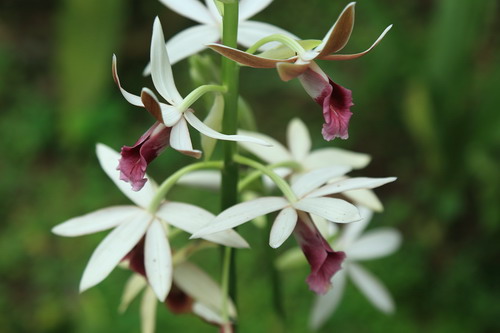 鹤顶兰(Phaius tancarvilleae (L’Hér.) Bl.)为兰科多年生常绿地生草本。植株大型,高70~80cm;假鳞茎圆锥状,粗短肥厚、肉质,被鞘;叶2~6枚,互生,阔长圆状披针形,长30~80厘米,宽6~12厘米,纸质,具纵向折扇状脉。总状花序由假鳞茎基部或叶腋抽出,粗壮直立,高达60~110 cm,着花10朵~30余朵,花大,美丽,直径7~10cm,背面白色,内面暗赭色或棕红色;唇瓣管状,与另外5个花被片巧妙组合,宛如仙鹤展翅飞翔。花被片的背面为白色,唇瓣为红色,因此又被称为“花白心红”,极富特色。花期春末夏初。