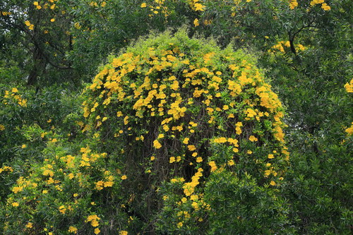 每年的春夏之交,华南植物园经济植物区高高的白千层树梢上便盛放出一簇簇明黄鲜亮的花朵,十分引人注目,许多游人更以为那就是白千层开的花。其实不然,它是一种人们不太熟悉的外来入侵植物——猫爪藤,虽比不上微甘菊恶名昭著,并有美丽的外表作掩饰,但是其温柔的杀伤力却是很大的,对生态平衡造成不小的破坏。