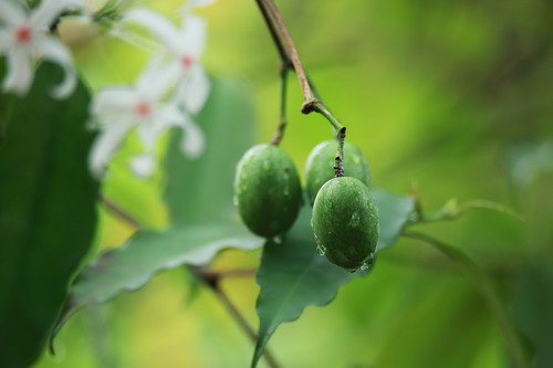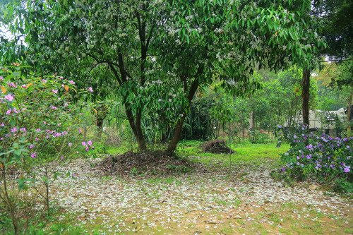 花开时灿烂,繁花满树,万千白蝶舞枝头;花落时凄美,边开边落,洋洋洒洒铺满地。捡起地上的落花仔细端详,洁白的花瓣中间一点红色,令人顿生怜惜之情,这就是蕊木开花时节的情景,边开边落,充满诗意。