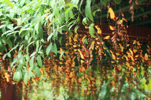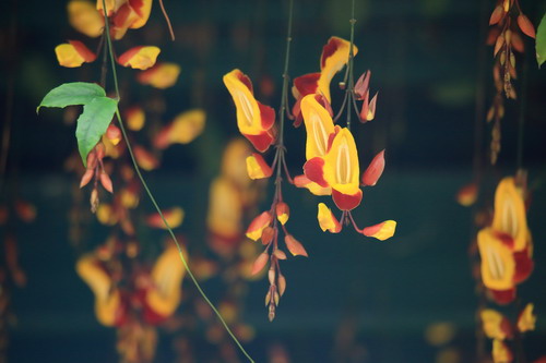 跳舞女郎(Thunbergia mysorensis (Wight) T. Anderson),爵床科(Acanthaceae)常绿藤本观花植物。总状花序,腋生,花序悬垂性,花萼2片,包覆1/3的花冠,花冠尖锄状,花冠内侧鲜黄色,外缘紫红色,连接成裙状,裂片反卷,宛如张开待食的鸦嘴,惟妙惟肖,所以她又有一个通俗的名字“黄花老鸦嘴”。