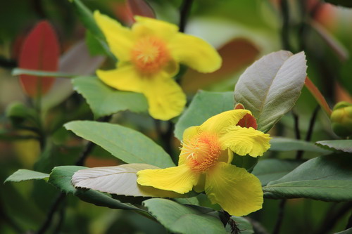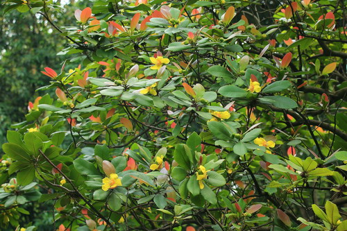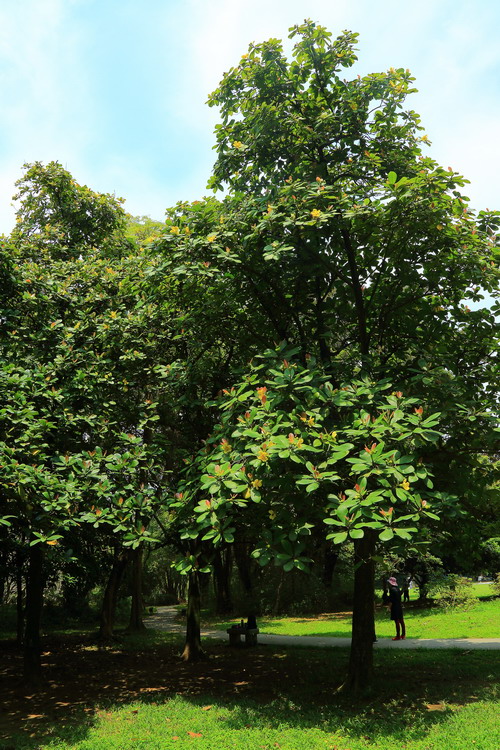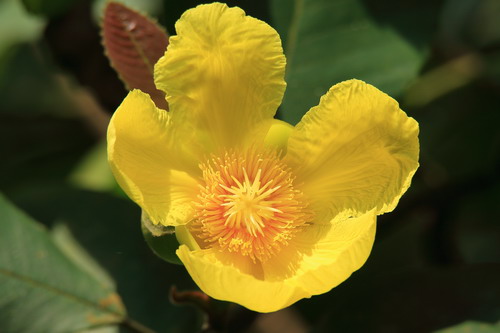 大花第伦桃(Dillenia turbinate Finet & Gagnep.),又名大花五桠果,第伦桃科(Dilleniaceae)常绿乔木。因其属名(Dillenia)音译为“第伦”,且果实形似桃子而得名。树高达30米,枝条、叶和总花梗上皆被褐色绒毛。叶互生革质,边缘有齿,新叶嫩红色。其叶与枇杷叶略似,故又名“假枇杷”、“枇杷果”。总状花序顶生,有花3-5朵,花大,有香气,花瓣黄色;雄蕊多数,排成两轮,花柱辐射状,花期3—6月。果实近球形包于增大的萼内,暗红色,多汁且略带酸味,可食,果期6—8月。