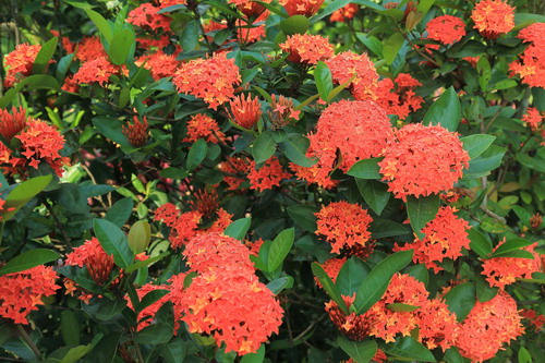 龙船花(Ixora chinensis Lam.),又名仙丹花、水绣球,茜草科(Rubiaceae)常绿小灌木。叶倒卵形至矩圆状披针形,新叶红色。聚伞花序顶生,花序具短梗,有红色分枝;花冠裂片4,花色以红色最为常见,还有白、黄、橙等色。花期5-12月。