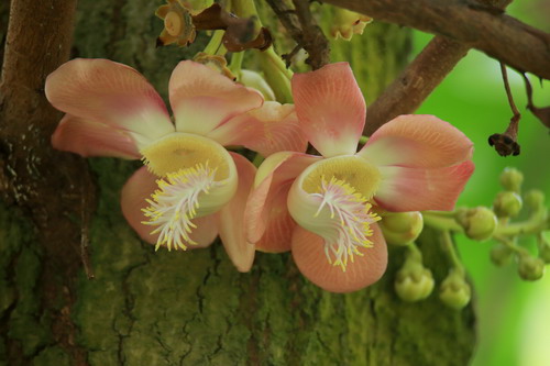 华南植物园温室内的炮弹树现正处于盛花期,但可惜的是,多年来未观察到结果。