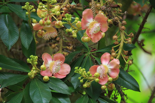 炮弹树(Couroupita guianensis Aubl.),玉蕊科(Lecythidaceae)落叶大乔木,高可达15米,叶片尤如一个个巨掌般,聚生于小枝顶端。花瓣浅碟状,内侧粉红或深红色,外侧淡黄色;聚生雄蕊紫红色,二型,短的形如毛刷,长的状似海葵的触须,发出淡淡清香。鲜艳的花朵一朵朵排成长长的穗状花序,生于树干或老枝上,非常引人瞩目,外形美观,色彩艳丽,花瓣腊质光亮。花期5月-11月。