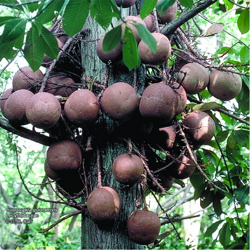 炮弹树的果实球形,茶褐色,大如拳头,浑圆如长满铁锈的古老的加农炮的炮弹,从树干一直到地面,一串串地挂在树干上,非常壮观。