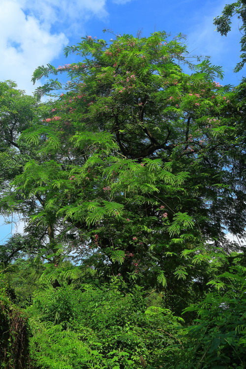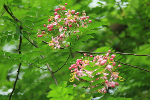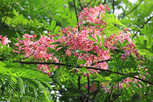 爪洼决明(Cassia javanica subsp. nodosa (Roxb.) K. Larsen & S. S. Larsen),豆科腊肠树属半落叶乔木。树冠开展。树皮灰黄褐色,粗糙。羽状复叶有小叶6—13对。花粉红色,开花时花叶相映,翩翩起舞,极为壮观。原产印度尼西亚、马来西亚、泰国。华南有栽培。花期5-6月。