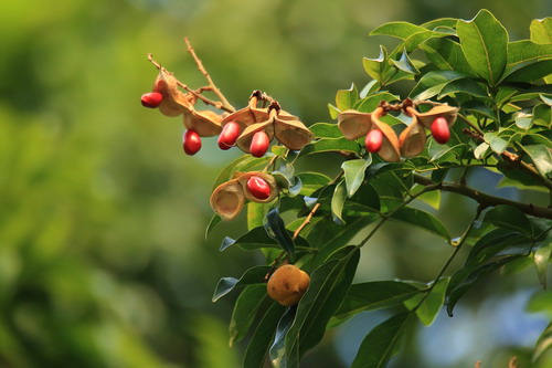 “红豆生南国,春来发几枝,愿君多采撷,此物最相思。”王维这首描写红豆的诗脍炙人口,广为流传,也使得“红豆”被称为“相思豆”。诗中的“红豆”指是红豆树(Ormosia hosiei Hemsl. et Wils.)的种子,它常被串成项链、手链等首饰,作为表达爱情和友谊的纪念品。而今天我们要介绍的植物——海南红豆,它与红豆树是同科同属的姐妹树,它的种子也是“红豆”的一种,也可用于制作饰品。如今华南植物园内的海南红豆花开正艳,再过2-3个月,我们就能在树下捡到红红的红豆种子了。
