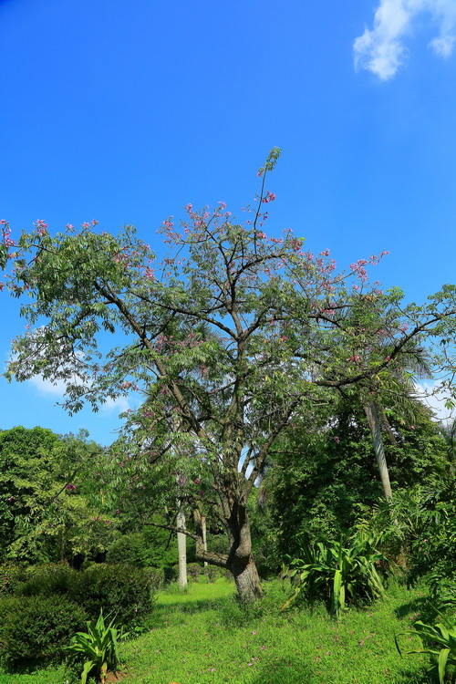 美丽异木棉(Ceiba speciosa (A.St.–Hil.) Ravenna),木棉科落叶大乔木。树干下部膨大,密生圆锥状皮刺。掌状复叶有小叶5—9片。花冠淡紫红色,中心白色;花瓣5枚,卵形,略反卷;花丝合生成雄蕊管。花期8—10月。美丽异木棉花谢后结果,果实有的大的像柚子,一个个如炮弹般倒挂在光秃秃的枝杈上,甚为壮观。果实成熟后,厚厚的外皮自然脱落,一团白色的絮状物脱颖而出,洁白炫目,悬挂在枝头,状如成熟开裂的棉花团,这些絮状物柔软性、保暖性还胜过真正的棉花,用它还可以填充枕头。美丽异木棉原产南美洲,华南植物园于1976年从美国洛杉矶引种并扩大繁殖。目前广植于广东、云南、海南、广西、福建等省区。