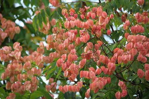 复羽叶栾树(Koelreuteria bipinnata Franch.),无患子科(Sapindaceae)乔木,高可达20余米;二回羽状复叶,嫩叶红色。顶生大型圆锥花序,花小金黄色。蒴果,果皮薄膜质,三角状卵形,成熟时橘红色或红褐色。种子圆球形,黑色有光泽。花期9~10月,果期11~12月。分布在我国北部与中部,以华北较为常见。日本、朝鲜也有。