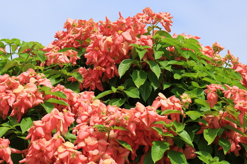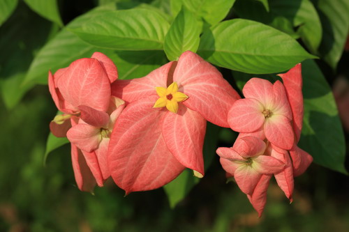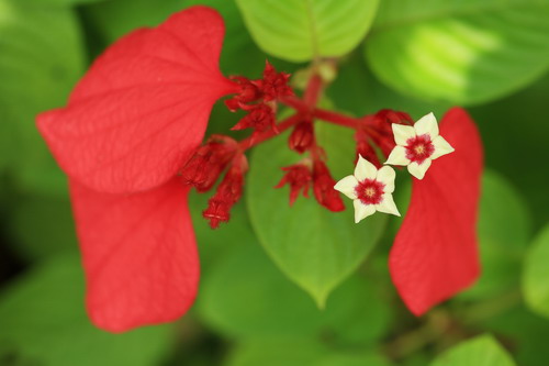 在地球上,不仅仅是人类会做五花八门的广告招揽生意,植物为了完成传宗接代的终极使命,会使出浑身解数招蝶引蝶来为它服务。由于自身那淡黄色的小小花儿实在不显眼,丝毫引不起狂蜂浪蝶的兴趣,但又必须依靠这些蜂蝶来传粉,玉叶金花属(Mussaenda)植物唯有想尽办法打出吸引眼球的广告来诱惑蜂蝶的青睐,于是聪明的它们将一枚萼片变态为鲜红色、桃红色、白色等叶片状,耀眼夺目。每当微风拂过,迎风摇曳,轻盈妩媚,舞姿翩翩,煞是好看,终于引得蜂儿忙蝶儿醉!