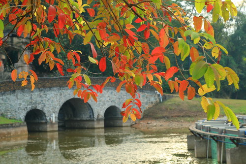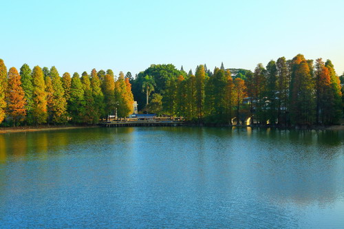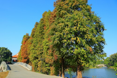 落羽杉红叶观赏地点:龙洞琪林、水生植物园两岸、科普信息中心前三拱桥边