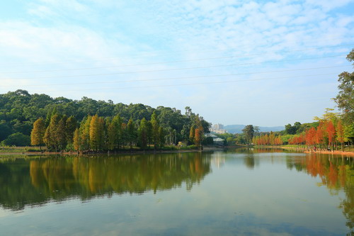 落羽杉(Taxodium distichum)喜欢生长在水边,华南植物园内有多处观赏落羽杉红叶的景点。如今,各个景点的树叶变色程度不同,最快的已基本全部变红,最慢的才刚刚开始变色,绿叶、黄叶共存。